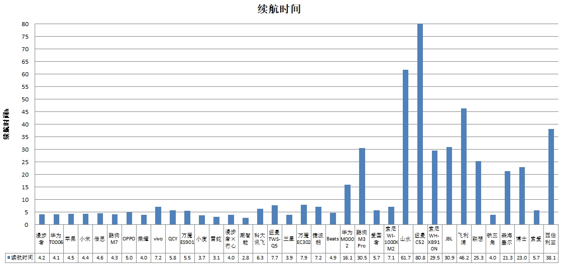 無線耳機的續(xù)航能力由無線耳機的續(xù)航時間和充電時間兩項指標(biāo)呈現(xiàn),各種類型的耳機有很大差別。