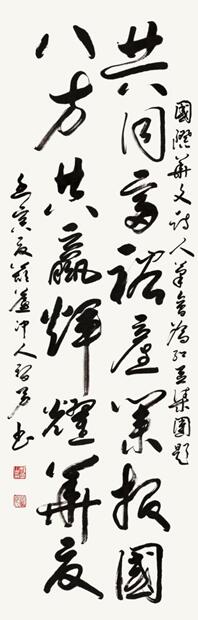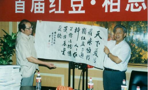 在《七夕,紅豆最相思的詩意探訪》論壇主題引導(dǎo)下,詩人們暢談紅豆愛情詩的淵源,以及對中國新詩的助推、發(fā)展的歷史作用,使中華文化傳統(tǒng)薪火相傳,在我們這一代詩人手里發(fā)揚(yáng)光大,繪出獨(dú)特的、現(xiàn)代人審美的愛情詩篇。會上,北京電視臺節(jié)目主持人、詩人黃殿琴朗誦了張?jiān)妱Α⒐鹋d華、綠島寫的紅豆愛情詩歌,并展示了多位詩人等為紅豆集團(tuán)寫的多幅書法,表達(dá)了友誼深情?!肮餐辉.a(chǎn)業(yè)報(bào)國 八方共贏輝煌華夏”是詩人黎勇先生寫給紅豆集團(tuán)的書法 ,國際華文詩人筆會主席張?jiān)妱懡o紅豆集團(tuán)書法為“紅豆最相思”等。