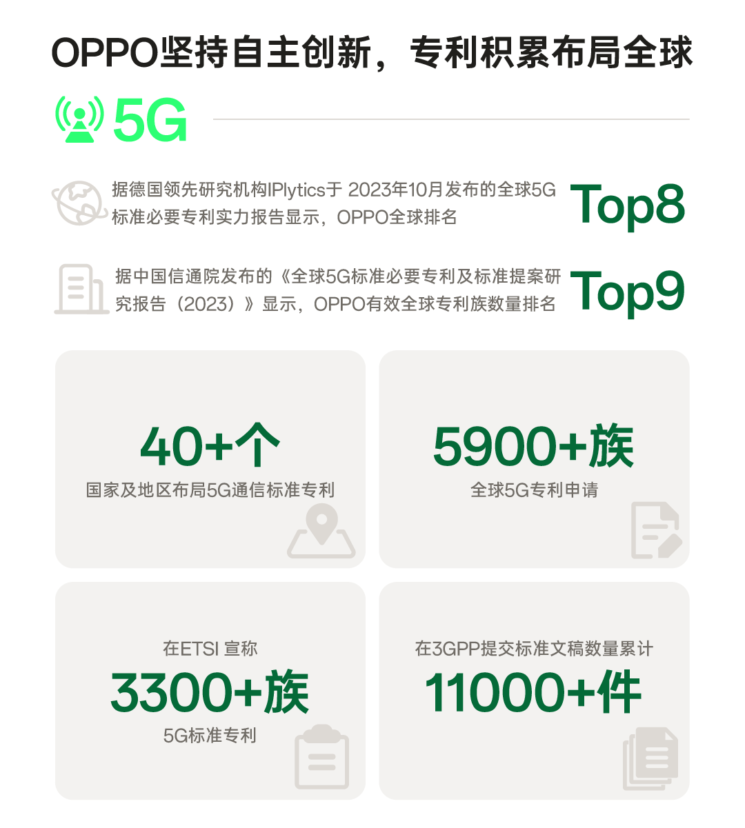 截至2023年12月31日,OPPO在全球40多個(gè)國(guó)家和地區(qū)布局5G通信標(biāo)準(zhǔn)專利,共完成5900+族全球?qū)@暾?qǐng),在ETSI聲明3300+族5G標(biāo)準(zhǔn)專利,在3GPP提交標(biāo)準(zhǔn)文稿數(shù)量累計(jì)超過11000件。根據(jù)中國(guó)信通院發(fā)布的《全球5G標(biāo)準(zhǔn)必要專利及標(biāo)準(zhǔn)提案研究報(bào)告(2023)》和IPlytics 在2023年10月發(fā)布的《全球5G標(biāo)準(zhǔn)必要專利實(shí)力報(bào)告》,OPPO 5G標(biāo)準(zhǔn)必要專利實(shí)力全球綜合排名均位居前列。