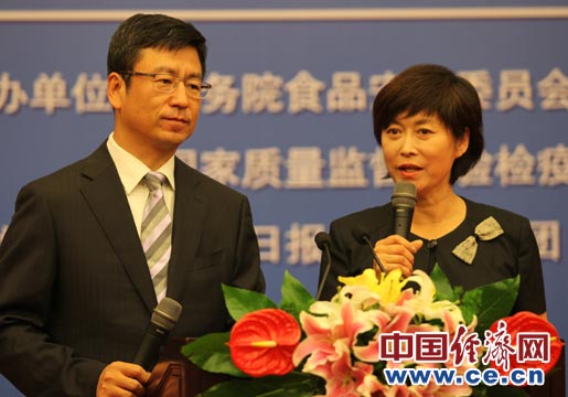 6月11日至17日被確定為今年的全國(guó)食品安全宣傳周。宣傳周主題為“共建誠(chéng)信家園 同鑄食品安全”。全國(guó)食品安全宣傳周啟動(dòng)儀式由國(guó)務(wù)院食品安全委員會(huì)辦公室、工業(yè)和信息化部、農(nóng)業(yè)部、商務(wù)部、衛(wèi)生部、國(guó)家工商總局、國(guó)家質(zhì)檢總局、國(guó)家糧食局、國(guó)家食品藥品監(jiān)管局、中國(guó)科協(xié)共同主辦,經(jīng)濟(jì)日?qǐng)?bào)社、中糧集團(tuán)承辦,中國(guó)經(jīng)濟(jì)網(wǎng)執(zhí)行承辦。圖為食品安全公益形象大使、中央電視臺(tái)主持人白巖松和敬一丹主持召開第四屆中國(guó)食品安全論壇主論壇。