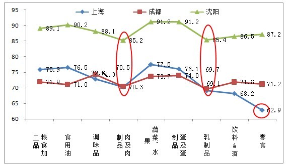 進(jìn)一步分析未來改善信心指數(shù)較低的上海、成都、沈陽三大城市,發(fā)現(xiàn)沈陽信心指數(shù)相對較高,上海和成都相對比較低。而且,肉及肉制品和乳制品依然成為三大城市普遍沒有信心的兩類食品。此外,上海對零食的改善信心也非常不足。