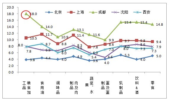 雖然成都、上海對食品安全過去一年的改善情況,現(xiàn)狀及未來發(fā)展趨勢都不是很樂觀,但是這兩個城市的安全信心指數(shù)增長情況卻是最快的。尤其是成都,其糧食加工品的安全信心指數(shù)增長高達(dá)18個點(diǎn)。