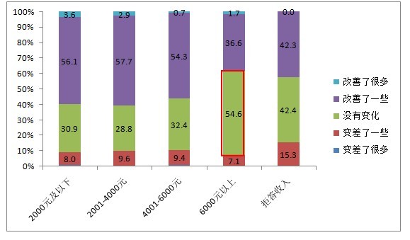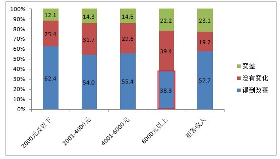 收入水平在6000元以上的市民,認(rèn)為過去一年食品安全沒有改善的人數(shù)遠(yuǎn)大于認(rèn)為有所改善的人數(shù)!