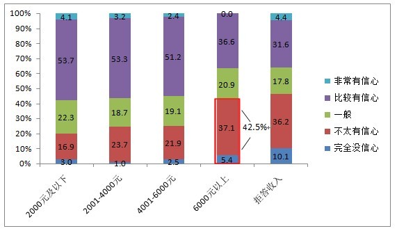 隨著人們收入水平的提高,大家對于食品安全越發(fā)沒有信心,數(shù)據(jù)顯示,除了拒絕透露收入水平的人群外,6000元以上的高收入人群對現(xiàn)狀沒有信心的比例最高,超四成。