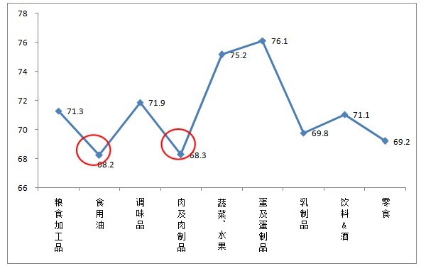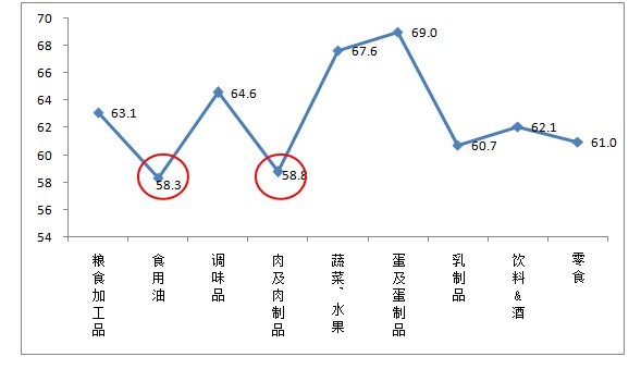 進(jìn)一步分析發(fā)現(xiàn),6000元以上高收入人群對食用油、肉及肉制品這兩類食品的安全信心指數(shù)最低,直接影響了對食品安全現(xiàn)狀整體的信任度。