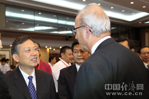 由中國道路交通安全協(xié)會、中國汽車技術(shù)研究中心和中國經(jīng)濟網(wǎng)共同主辦的“2013中國道路交通安全論壇”于8月29日在北京首都大酒店舉行。圖為公安部副部長黃明與國際道路交通安全協(xié)會主席高斯進行交流。中國經(jīng)濟網(wǎng) 郝紅波 攝影