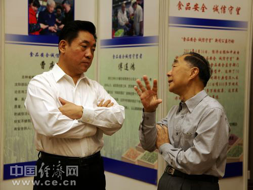 2013年全國食品安全宣傳周啟動儀式暨第五屆中國食品安全論壇6月17日在北京舉辦,今年主題為“社會共治 同心攜手維護食品安全”。圖為食品藥品監(jiān)管總局副局長劉佩智(左)和中國工程院院士陳君石參觀食品安全“誠信守望者”展覽。中國經濟網(wǎng) 王耀峰/攝