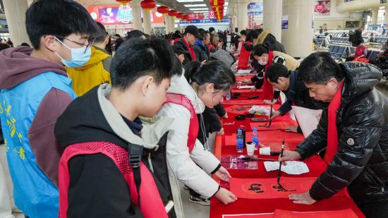 文化展示區(qū)里,傳統(tǒng)韻味與暖心服務(wù)交織成獨(dú)特風(fēng)景。鐵路部門(mén)、大連車站派出所、大連市慈善總會(huì)、大連青年書(shū)協(xié)的書(shū)法愛(ài)好者們揮毫潑墨,一幅幅春聯(lián)、一個(gè)個(gè)福字飽含美好祝愿,免費(fèi)送到旅客手中;紅包拓印體驗(yàn)更讓大家親手解鎖新春儀式感,沉浸式感受傳統(tǒng)年俗的魅力。大連北站的非遺展示區(qū)人氣爆棚:剪紙藝人指尖生花,一張張馬年主題剪紙惟妙惟肖;吹糖人、面塑攤位前,孩子們圍攏觀望,老師傅們巧手翻飛,將滾燙的糖漿、柔軟的面團(tuán)化作形態(tài)各異的小動(dòng)物,引得陣陣歡呼;五谷畫(huà)展臺(tái)則以各色谷物為料,勾勒出寓意吉祥的新春圖景,讓旅客直觀感受傳統(tǒng)技藝的匠心與溫度。